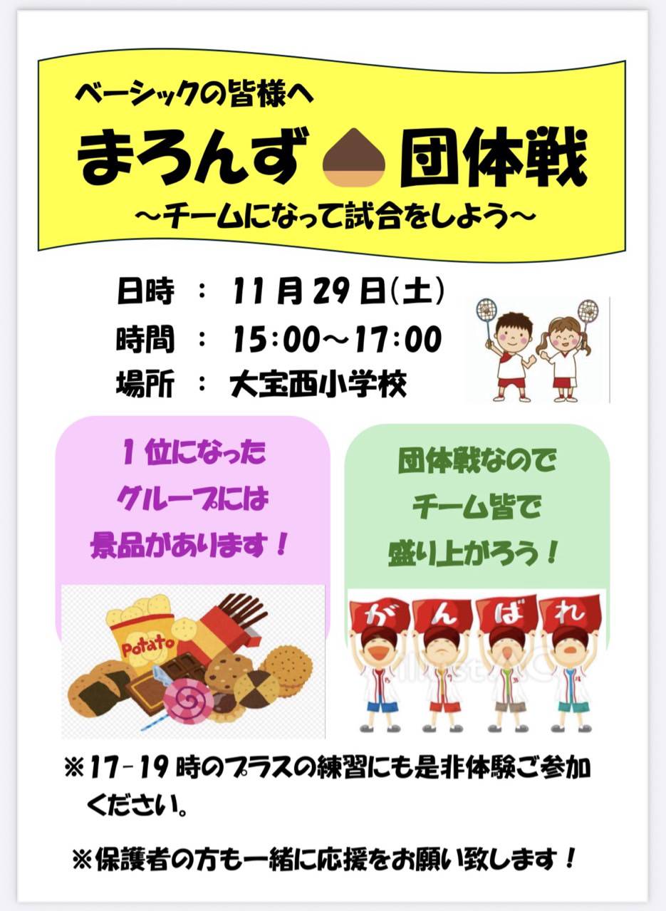 まろんず団体戦〜チームになって試合をしよう〜 日時2025.11.29 時間15:00~17:00 場所大宝西小学校 申し込みフォーム 必須お名前 例)山田 太郎 必須メールアドレス 例)info@mail.com 必須電話番号 例)09012345678 任意備考欄 ご質問等をご記入ください 「個人情報の取り扱いについて」をご確認ください。 個人情報の取り扱いに同意します。 Please leave this field empty.