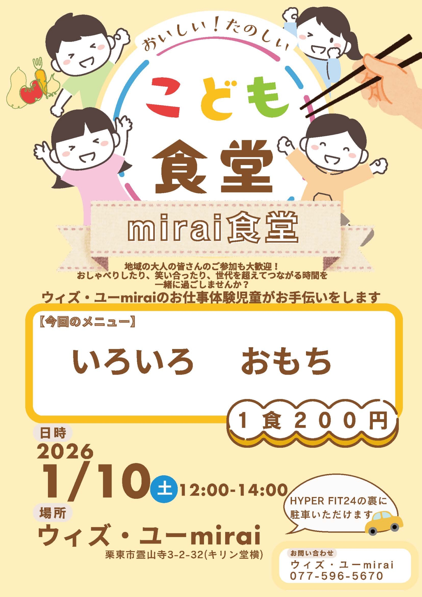 1月のmirai食堂<こども食堂> 日時2026.01.10 時間12:00~14:00 場所ウィズ・ユーmirai 【今回のメニュー】 いろいろ おもち 申し込みフォーム 必須お名前 例)山田 太郎 必須メールアドレス 例)info@mail.com 必須電話番号 例)09012345678 任意備考欄 ご質問等をご記入ください 「個人情報の取り扱いについて」をご確認ください。 個人情報の取り扱いに同意します。 Please leave this field empty.